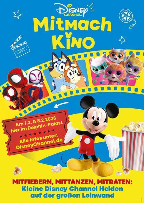 Kino bedeutet Licht aus, Ruhe und Stillsitzen? Nicht beim Disney Channel Mitmach-Kino! Hier dürfen Kinder eine Stunde lang lautstark mitsingen, tanzen, klatschen und rätseln – eben alles, nur nicht leise sein!
